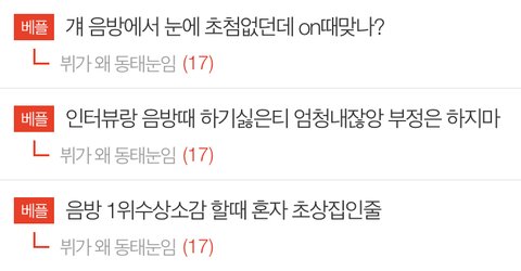 며칠 전부터 계속 올라온 글이 뷔 표정 궁예 아무 소용 없다는 거였는데..ㅋㅋ 뭐 너희들은 보지도 않았겠지 연예인들 진짜 힘들어서 어떡하냐 그냥 무표정 지어도 동태 눈깔 소리 듣고 온갖 궁예 당하고 작작 좀 해 제발