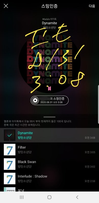 다이너마니트 노래 개좋아 어떻게 노래가 들으면 들을 수록 더 좋아지지? 이말만 nn번은 한 거 같은데 어쩔 수 업슴 팬톡도 허락해야 됨 솔직히 노래가 너무 좋잖아 ;;