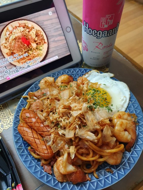 새우와 베이컨 그리고 소세지에 가스오부시 올려서 먹었어요