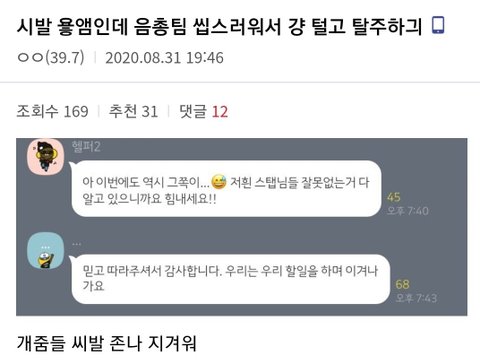 근데 사과문 이후 김요한 음총팀 헬퍼방에서 그쪽팬덤이 또,, 우린 잘못없으니 걍 신경쓰지말고 열심히하자 이런 내용 나눔
