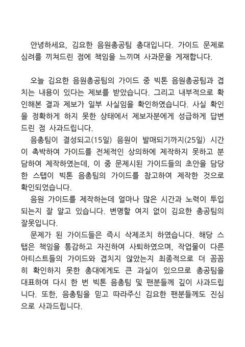 제발 제대로 된 사과문 올려주고 빅톤음총팀에게 사과 똑바로 하길바람