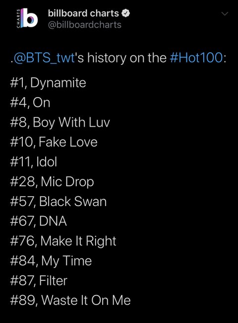 그냥 단순히 한국 최초라고 표현하기에는 너무 많은 상징성이 있는 기록 아닌가? 빈집도 아니고 개 꽉찬 집에 늘상 조롱과 차별의 대상이던 아시아 가수가 그것도 보이밴드가(방탄 이전에 핫백 1위한 보이밴드가 전세계에서 딱 3팀임) 2위와 두 배 정도 차이가 나는 수치로 전세계에서 가장 큰 음악시장을 다른 것 하나 없이 노래 만으로 1등을 한다? 이건 진짜 형용할 수가 없는 거지 그냥 역사야 역사 그 자체로
