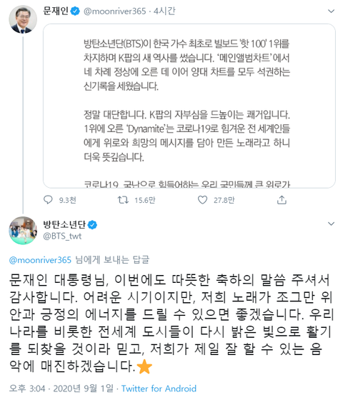 ++ 문재인 대통령 축전에 답한 방탄소년단