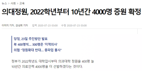 2022년부터 10년간 의대 입학 정원을 늘려서 매년 400명씩 10년간 총 4000명을 정원할 계획을 세우고 있어. 이번에 코로나19가 터지면서 의료진들이 너무 고생 많이 하고 있잖아ㅠㅠ 그래서 쉽게 생각했을 때는 좋은 계획이라고 생각했는데 지금 의사들이 파업하는 큰 이유 중에 하나가 이거 때문이더라고... 자기네들 좋은 일 해주겠다는데 왜 파업을 하는지 선뜻 이해가 안 됐지