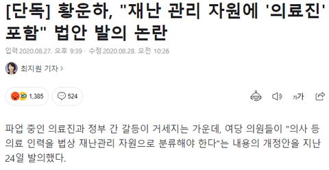 이 법안이 뭐냐면 현재 '재난 및 안전 관리 기본법' 제34조 1항에 따르면 "재난관리 책임기관의 장은 재난의 수습활동에 필요한 대통령령으로 정하는 장비, 물자, 자재 및 시설을 비축·관리해야 한다" 고 되어 있는데 자재 및 시설에 "인력(사람)" 즉 "의료진"도 포함하자는 내용이야. 근데 같은 시기에 이런 기사도 나왔어.