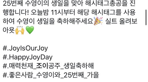 얘더라 내일 조이 생일이야 좋은말은 못달아줘도 사람 깎아내리는 말 오늘만큼이라도 하지말아주라 우리애 서치 잘하는데 혹시라도 볼까봐 겁난다
