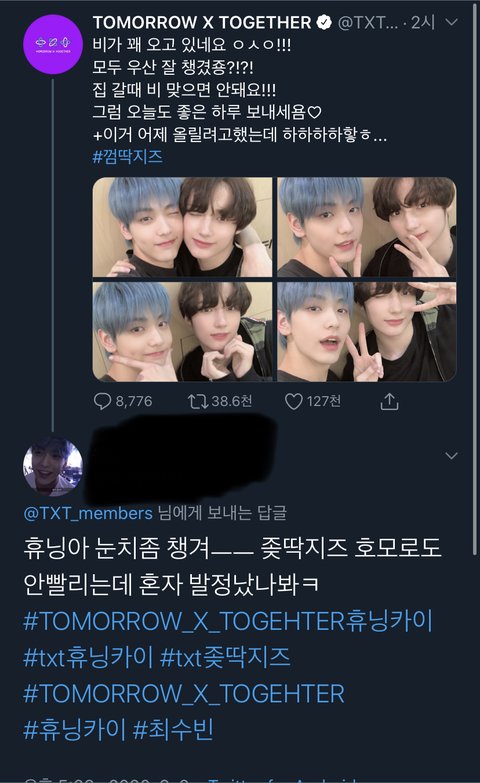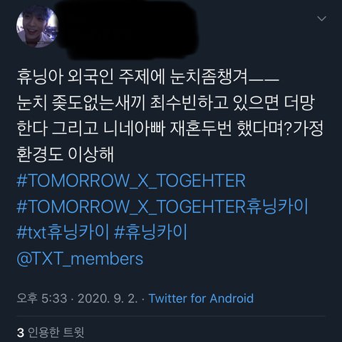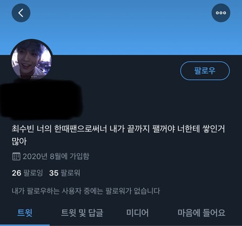 좇딱지즈는 또 뭐노... 뭘 끝까지 팬다는건지 휴닝카이랑 최수빈이랑 사진 찍는게 왜 그렇게 싫은건지 투바투 공계에 지1랄...