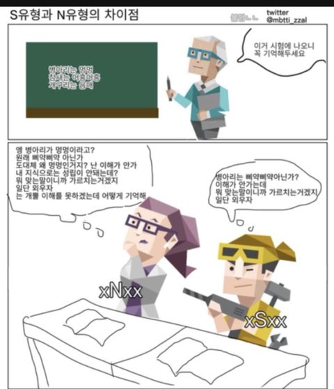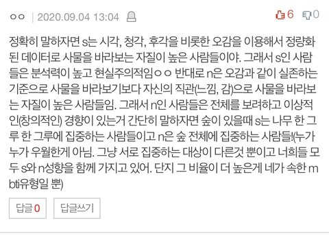 댓글보면 자기가 이것도 맞고 저것도 맞아서 헷갈린다는 애들 있는데 그건 너네 성향에 s랑 n이 각각 40%,60% 이런식으로 큰 차이 없게 있어서 그럼ㅇㅇ