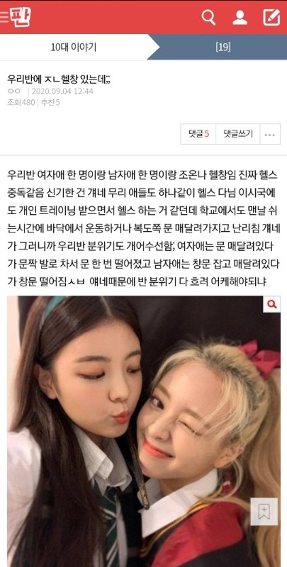 우리반 여자애 한 명이랑 남자애 한 명이랑 조온나 헬창임 진짜 헬스중독같음 신기한 건 걔네 무리 애들도 하나같이 헬스 다님 이시국에도 개인 트레이닝 받으면서 헬스 하는 거 같던데 학교에서도 맨날 쉬는시간에 바닥에서 운동하거나 복도쪽 문 매달려가지고 난리침 걔네가 그러니까 우리반 분위기도 개어수선함; 여자애는 문 매달려있다가 문짝 발로 차서 문 한 번 떨어졌고 남자애는 창문 잡고 매달려있다가 창문 떨어짐ㅅㅂ 얘네때문에 반 분위기 다 흐려 어케해야되냐