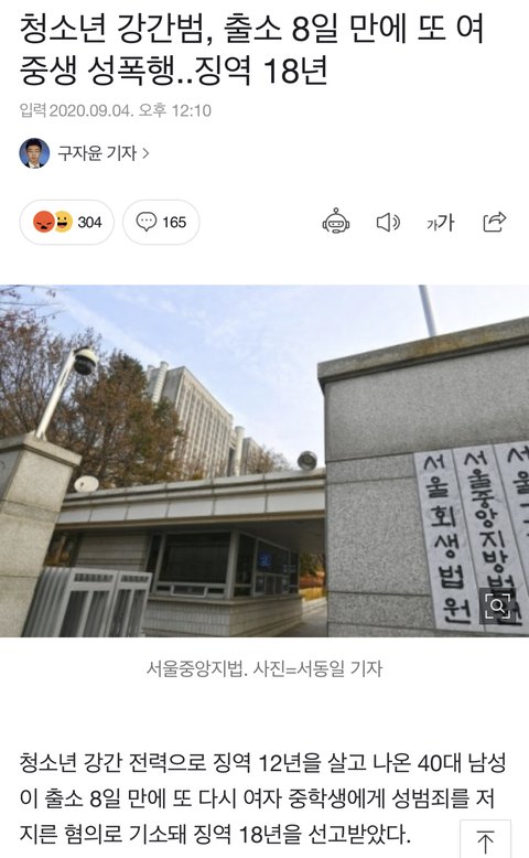 4회 청소년 강간범 출소 8일만에 또 여중생 성폭행