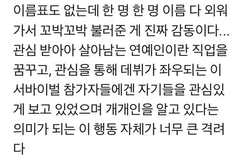 조카 다정하더라 이름 다 외워갔던데 ㅋㅋㅋㅋㅋ 진짜 신경쓴 거 많이 보였음 분위기 풀어주려고 일부러 더 밝게 진행해주고 호응 잔뜩 해주고 한명한명 이름 꼭 불러주던데 센스있다고 느껴지더라 막 와 선우!!!!!! 타키~!!! 이야 성훈아~ 오 정원이 잘하는데? 이런 식으로 이름 한번씩은 꼭 불러주던데 나였으면 엄청 고맙고 감동받았을듯 내 롤모델이 내 이름을 외워서 불러주는거잖아