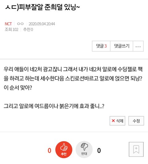 밑에 사진 보다시피 어제 알로에 수딩젤팩에 대해서 물어본 준희야! 어제 밤에 세수-토너-알로에 수딩젤 듬뿍 묻히고 몇시간 후에 잤어 근데 웬일.. 아침에 피부 보는데 개놀랐어ㅋㅋㅋㅋㅋㅋ진심 어제 처음한건데 피부가 진정된게 눈에 보여가지고.. 확실히 붉은기가 많이 없어지고 여드름도 많이 안 심해 보이는 효과가 나타났어!! 근데 턱에 아주작은 좁쌀여드름이 났더라 근데 내가 좁쌀이 자주나서 알로에 때문은 아닐수도 있엉! 무튼 그러고나서 오늘 아침에 세수를 하는데 거의 바른지 12시간이 지났는데도 세수 할 때 손에 알로에 촉감이 느껴졌어 얼굴에 알로에가 남아있나봐ㅋㅋㅋ 신기했어 세수 다 끝내고 스킨로션 바르고 거울 다시봤는데 아무래도 세수하면 손이 얼굴을 닿아서 그런지 붉은기는 돌아오더라..ㅠㅠ 그래도 꾸준히 하면 피부 진짜 좋아질것 같아서 꾸준히 하려고! 네2처 알로에 한 통 더 사야겠담ㅋㅋㅋ 준희들도 알로에팩 꼭 해봐! 강추임!!(알로에가 안 맞는 사람도 있긴있대 참고해줭~~)