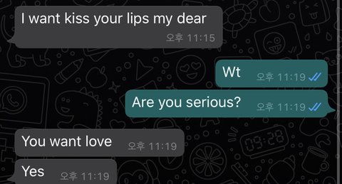 이거 성적인 농담인거야....? 하 진짜 개존잘 양남이라서 왓츠앱으로 와서 연락하고 있는데 말하는게 쩜.... 내 사진 보내 달라고 해서 그냥 한장 보내줬거든...? 근데 저럼 ㅠㅠㅜㅠㅠㅠㅠㅠㅠ 진심이냐 하니까 진심이래...;;;; 그냥 장난인거야...?