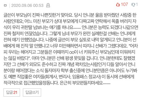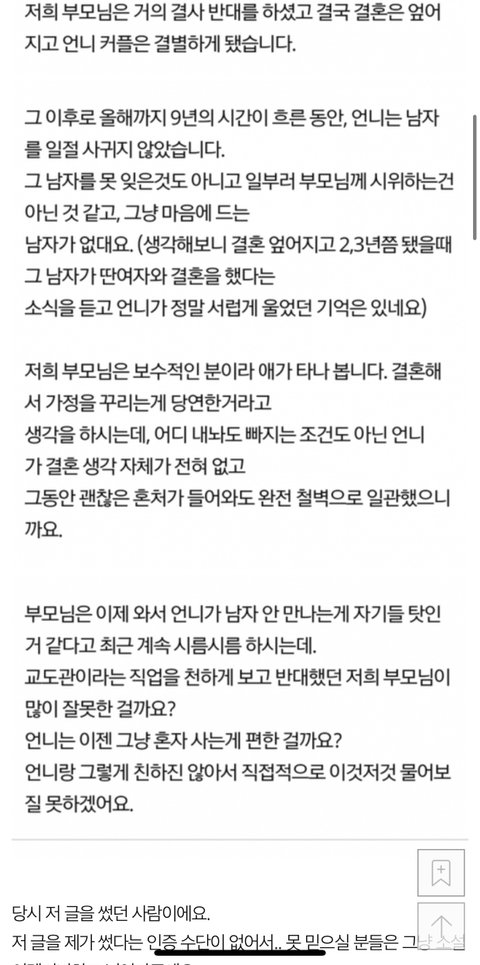 저때는 부모님 욕이 생각보다 훨씬 너무 많이 올라와서 겁나서 글을 지웠습니다. 그리고 부모님이 잘못한 건 당연히 알았지만 저는 저 당시에는 진심으로 언니 심정도 이해가 안됐었거든요. ' 인물좋고 성격괜찮아 보이고, 우리 부모님 보기에도 (교도관이 나쁘다는게 아니라)직업 번듯한 남자들도 언니한테 대시를 많이 했는데 굳이 왜 저렇게 과거 남자를 잊지 못해서 저럴까' 싶었어요. 제가 제 성씨를 그대로 노출시킨 바람에 누군가 절 알아보는 게 불편했었구요.