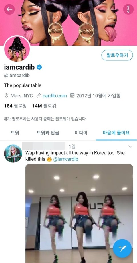 헐 카디비가 CLC 장승연 영상에 좋아요 눌러줌