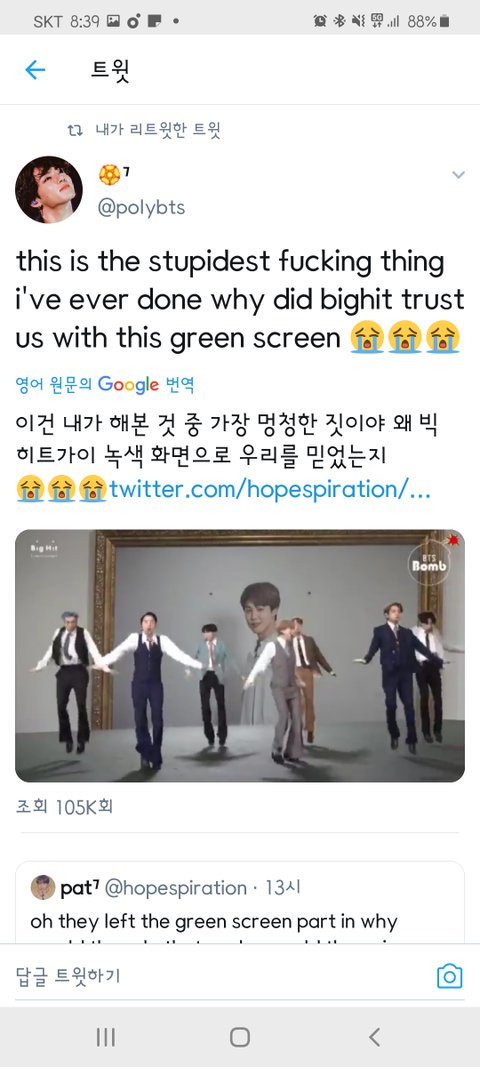 비하인드 영상에 크로마키 초록색 배경화면을 제공한 큰그림 잘못이라며 계속 타래가 붙고있음ㅋㅋㅋㅋㅋ