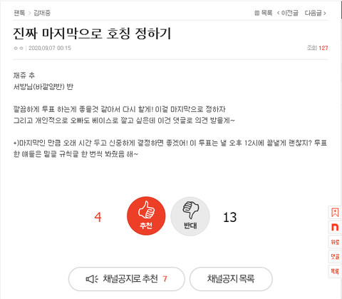 첫 투표가 재쥬로 결정났는데 중복투표도 많았고 다른 의견도 쨍쨍해서 마지막으로 재쥬랑 서방님으로 추반투표 해서 서방님(바깥양반)으로 결정났어!