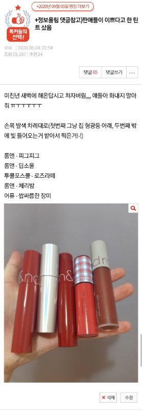 +추가) 아 진짜 판 이런거 개지겹네 ㅋㅋㅋㅋ 뭐 나 포함 여러명이 효과 본 제품인데 제품 이름 말하기만 하면 광고래 ㅋㅋㅋㅋㅋ 나 전에 립 5개 발색 쓰니인데 광고라 말하는 몇몇애들아 너네 말대로면 이것도 광고였냐...? 아 진짜 개쳐웃기네 듣보 브랜드 좋답시고 글 올렸으면 모르겠는데 이게 듣보 브랜드냐고 ㅋㅋㅋㅋㅋ 억울해 뒤지겠네 ㅠㅜㅜㅜㅠ