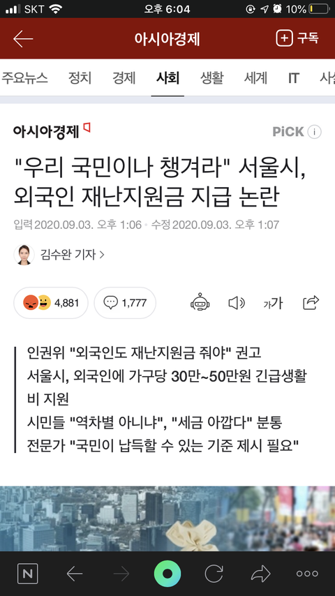 국민들한테도 안주는 재난지원금을 외국인들한테 왜줘??;;
