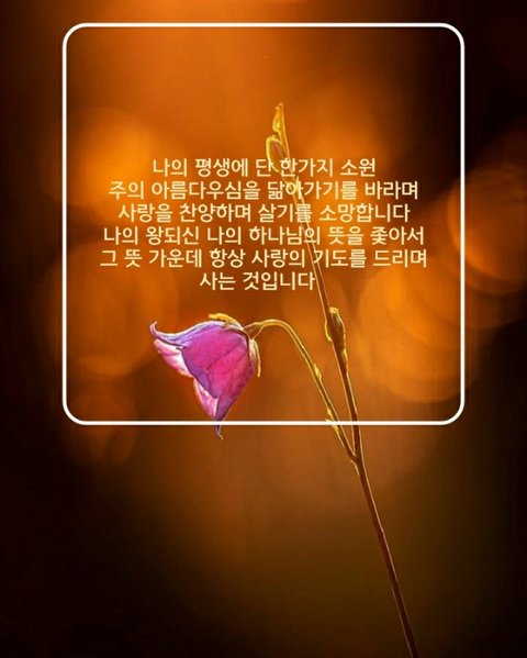 나의 평생에 단 한가지 소원 주의 아름다우심을 닮아가기를 바라며 사랑을 찬양하며 살기를 소망합니다 나의 왕되신 나의 하나님의 뜻을 좇아서 그 뜻 가운데 항상 사랑의 기도를 드리며 사는 것입니다