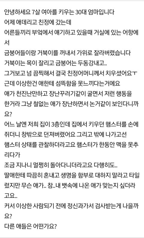 정말 소름 돋았습니다. 나이 불문하고 그렇게 잔혹하게 행동하는 애가 평범하다고 생각하는건 아니시죠? 여기에 정신과 가야되냐고 물을 시간에 당장 가시기 바랍니다. ╋) 그대로 뒀다가 님이 거북이고 금붕어가 될 수 있습니다.