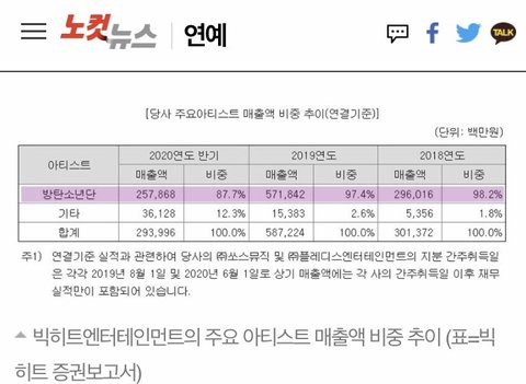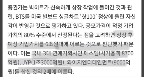 코로나에도 불구하고 올 상반기 매출은 전년과 비슷한 수준을 유지했고, 상장으로 이어질 경우 예상 기업가치가 6조원대에 이른다고 한다. 이는 무려 국내 3대 기획사인 SM YG JYP를 모두 합친 것의 2배나 된다