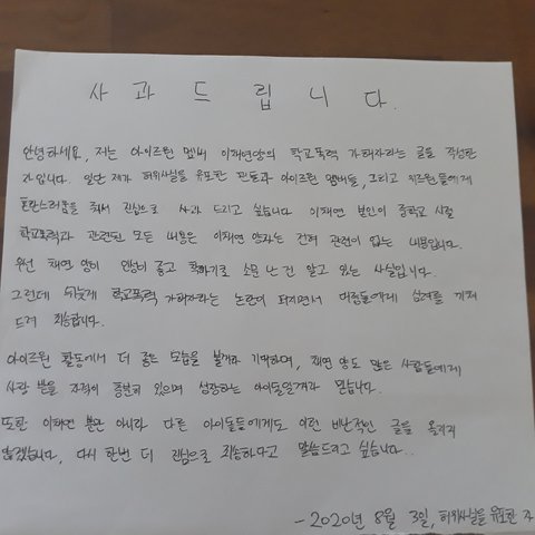 약 한달 전 이채연의 학교폭력 가해자를 허위사실 유포를 사과드린 자입니다. 여초사이트에 올라와 있는 이채연 학교폭력 가해자로 논란을 만들어 죄송합니다.