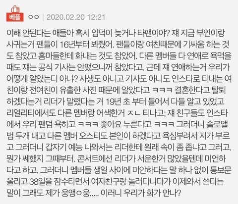 팬분들, 타 팬분들, 일반인 모든 분들께 하고 싶은 말이 있습니다. 자신이 뱉었던 말에 언행 불일치로 임하며 다른 사람들에게 피해를 준다면 그것은 잘하는 일이 맞을까요. 자신의 가정을 지킨다는 그 책임은 맞습니다. 하지만 그로 인해 타인의 멤버들까지 그 책임을 떠안고 피해를 본다면 그건 과연 본인이 책임을 지고 있다고 말할 수 있는 건가요. 무려 함께 하고 있는 소중한 멤버들에게 자신의 이기심을 강요하며 본인은 행복을 누리겠다는 그 마음을 여러분은 이해해 주실 수 있나요?