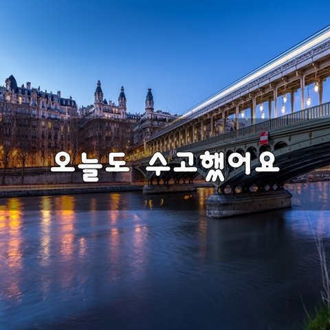 ♥ 오늘도 수고했어요 ♥ 남들이 알아주지 않아도 꿋꿋이 그 길을 가는 당신, 오늘도 수고했어요. 인생의 정답을 알 순 없겠지만 답과 가까워지려고 열심히 달리는 당신, 오늘도 수고했어요. 가슴 속 꿈을 놓치지 않으려고 꿈에게 계속 말을 걸고 쓰다듬어주는 당신, 오늘도 수고했어요. 그 누구도 아픔을 안아주지 않아도 애써 미소 지으며남의 아픔을 먼저 알아채준 당신, 오늘도 수고했어요. 빛이 있다고 믿고 다가갔지만 만난 건 어둠이었지만 그래도 다시 희망을 믿고 있는 당신, 오늘도 수고했어요. 이 세상에 이름 없는 꽃은 없다며 길섶에 핀 꽃에게 이름을 불러준 당신, 오늘도 수고했어요. 나를 아는 사람, 나를 모르는 사람, 나나 너나 우리 모두 다 수고했어요. 오늘도. - 김이율 -