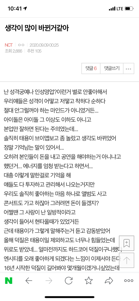 나도 나이가 많이 들어서... 언제까지 좋아하나싶기도 하고 괜히 싱숭생숭했던 차에 태용이 브이앱보고 생각이 많아져서 끄적여봤는데... 이곳은 내가 처음 엔시티를 좋아하고