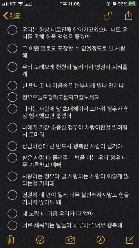 쫌 오글거려도 이해해줘 내가 원래 이렇게 감성적인 사람이 아니였는데 ㅋㅋㅋㅋㅋ.. 자꾸 생각나고 하고싶은 말이 너무 많았는데 버블에 보내고싶어도 제한이 있어서 메모에라도 끄적여봤어 부끄럽지만 즈니들도 나랑 같은 생각을 가지고 있는 사람이 많을 것 같애서 공유해본다,,, 너무 오글거리면 먹금해줘.... 우리 정우 행복했으면 좋겠네 정우야 오늘도 잘자