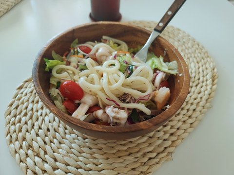 오징어와 새우 방울토마토를 많이 넣고 산뜻하게 만든 샐러드우동