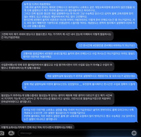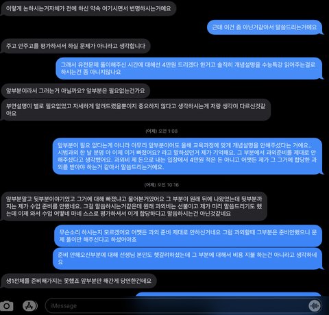 제가 과외가 필요해서 수험생카페에서 과외선생님을 구하게 되었어요. 제가 연락드려서 얘기 나누고 시범과외 받아보고싶다고 여쭤봤더니 똑같이 시급4만원을 받으신다하셨습니다. 여태까지 과외 해본 경험상 한번하고 그만둘정도로 별로였던 쌤들도 없었고 보통은 꾸준히 했었기에 당연히 그럴줄 알고 알겠다 하셨습니다