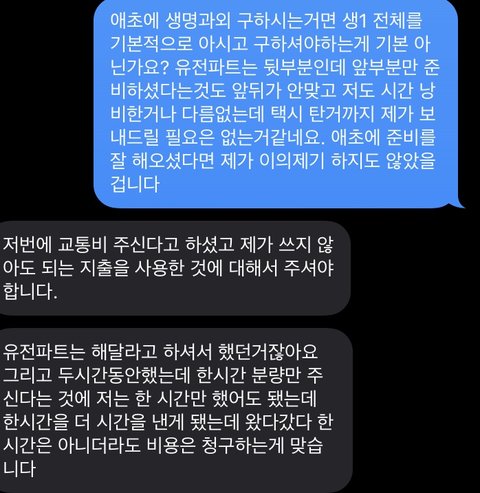 몇번 문자 주고 받고 결국엔 한시간 시급과 음료비 택시비를 달라고 하시더라구요 그래서 시급과 음료비는 지불해드렸지만 이상황에서 제가 그분 택시비까지 드려야하는건가요??그 분 입장은 자기가 쓰지않아도 되는 돈을 써서 받아야겠다네요.