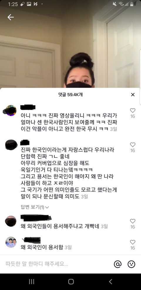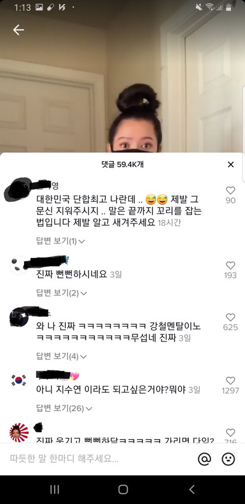 어제까지만 해도 '나는 엄마가 없습니다' 이런 글이 베스트 댓글이었습니다.. 현재는 대부분 삭제된 상태. 근데 아직도 온갖 욕으로 도배되어있고, 제가 프로필 다 가렸지만 들어가보면 어김없이 초딩, 중딩 애들이었습니다. 거의다 초등학생이고요.. 그와중에 한국인 단합력 쩐다 이지랄 떨고 지들이 무슨짓을 하는지 모르는 우매한 아이들이 너무 많습니다.