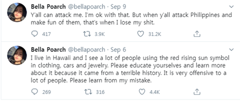 그런데 이번에 Bella poarch라는 팔로워 1700만(하루에 100만씩 오르고 있는 추세)필리핀 사람이 왼쪽 팔에 욱일기 문신을 한 적이 있습니다. 뭐 외국인이 욱일기 뜻을 모를 수도 있죠. 저희야 기분 나쁘지만 무지한 건 죄가 아니니 가르쳐주면 되는거고요. 근데 문제는 그후에 시작되었습니다. 틱톡에서 초딩 애ㅅㄲ들이 선넘는 발언을 시작했습니다.