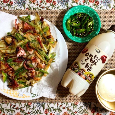 해물 넣어서 전 만들고 좋아하는 알밤 막걸리 편의점에서 사와서 집에서 후다닥 먹었습니당