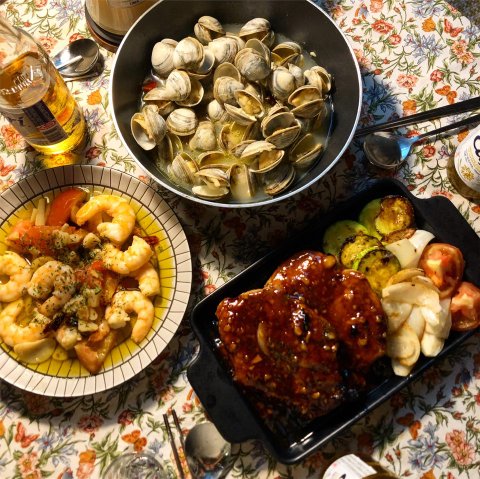 1. 친구들 놀러 온다고 해서 급하게 준비한 모시조개술찜과 목살 스테이크 감바스