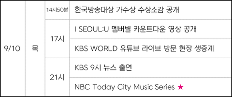 오늘 스케줄이다!! 이삐들 즐겨즐겨!! 그리고 스밍은 숨쉬듯이!! 뮤비는 시간나면 틈틈히!! 해야되는 투표들 잊지말고 챙겨!!!