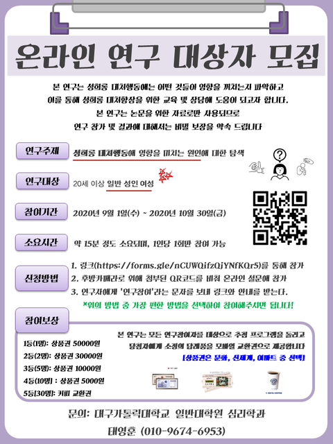 현재 석사논문으로 성희롱 대처행동과 관련한 연구를 진행하고 있으며 성인 여성을 대상으로하여 모집하고 있습니다.