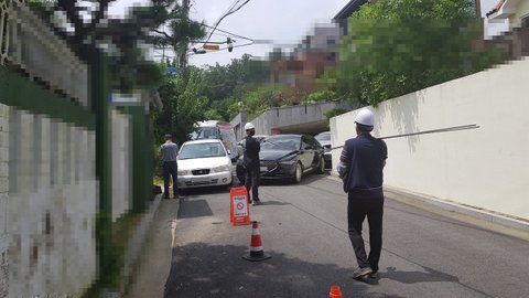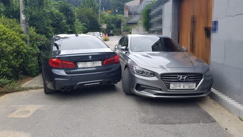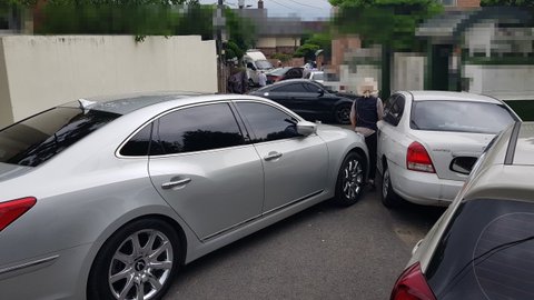 공사 인부 분들을 몸으로 막는 건 기본이고 공사 차량 진입을 막으려고 이렇게 개판으로 주차를 항상 해놓는데 (부자들이라 좋은 차도 여러 대네요. 차 들을 이리저리 옮겨가며 1년 넘게 이렇게 주차하는데도 아무도 제지를 안해줍니다) 안하는건지 못하는건지 경찰이든 구청이든 차 빼시라고 제지해주는 곳이 없습니다.