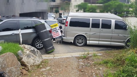 저희 입장에서는 어이가 없지만 공사비만 나가고 1년이 넘도록 공사 진행이 안되고 있는 기가 막힌 상황입니다. 공사를 막으려고 주차가 이런 식으로 되어 있습니다.