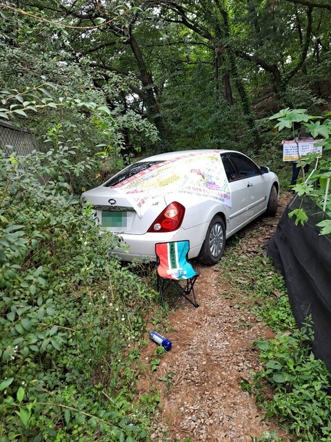 충돌을 피하려고 인부 분들께서 뒷산 등산로를 통해 공사 자재를 옮기시면 등산로 위까지 차를 가져오셔서 등산로까지 막아 버립니다.