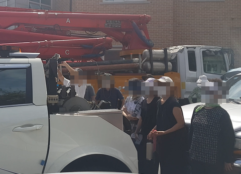 저희가 공사를 하려고 하면 아래 사진들처럼 누군지 알 수 없는 분들이 우루루 몰려 나와 공사를 하루 종일 물리적으로 막습니다. 차로 도로 통행 자체를 아예 막아 버려 공사 차량 진입을 고의적으로 막는 것은 물론이고, 차들 사이로 힘겹게 지나가는 공사 인부 분들의 진입은 온몸으로 막습니다.