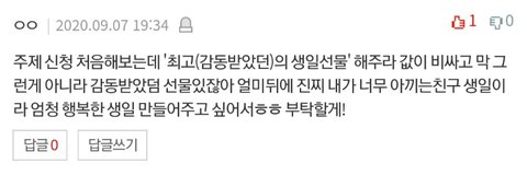 나는 무슨 선물을 주던 다 진심으로 고마운데 그 중에 더 좋았던거 말해보자면 손편지가 제일 좋았고 케이크 받은적 딱 한 번 있는데 생일이여서 그런지 진짜 좋았어!!