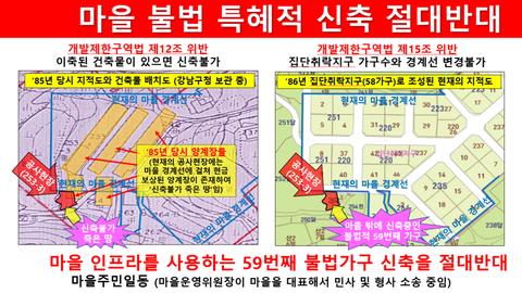 그런데 이 법적 제한을 벗어나 강남구청이 건축주에게 취락지구 경계선에 접한 토지이면서 35년 전에 이축한 양계장이 있는 잔여대지에 59번째 가구를 지을 수 있도록 건축허가를 내준 것은 법리적으로 있을 수 없는 일로써 의혹을 받고 있습니다. 이에 저희 마을 주민들도 건축주와 강남구청을 대상으로 행정소송과 형사소송을 진행 중입니다.
