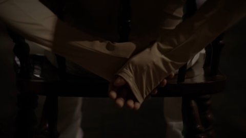 손이 묶여있는채 뾰족한 무언갈 들고 요리조리 살피는 서스펙트? 이노센트?