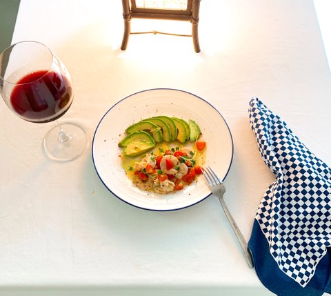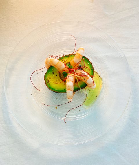 껍질을 벗겨낸 아보카도는 취향대로 먹기 좋게 잘라 그릇에 내고 새우 마리네를 함께 해준다.