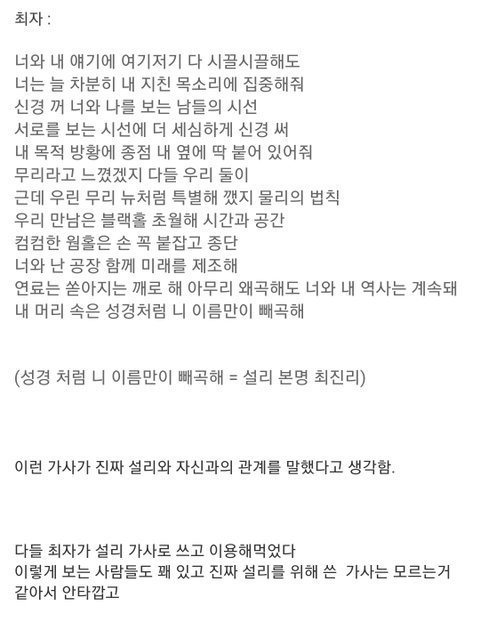 설리는 진심으로 기댈 사람이 필요했던 거고 최자한테 설리는 과시용이었던 거고