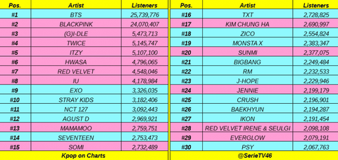 블핑팬들은 대체 왜 지들이 액셀표 만들어서 가지고 다니냐? 웃긴게 얘네팬들이 만든표들 보면 무슨기준인지 토픽 적어두지도 않음 스포티파이 가수별 스밍량보면 1위 방탄이 115억인데 이건 무슨 기준인지 블핑이랑 별차이 안나게 만들었네 오히려 블핑은 스포티 서비스 최근에 시작한 트와랑 별차이 안나던데